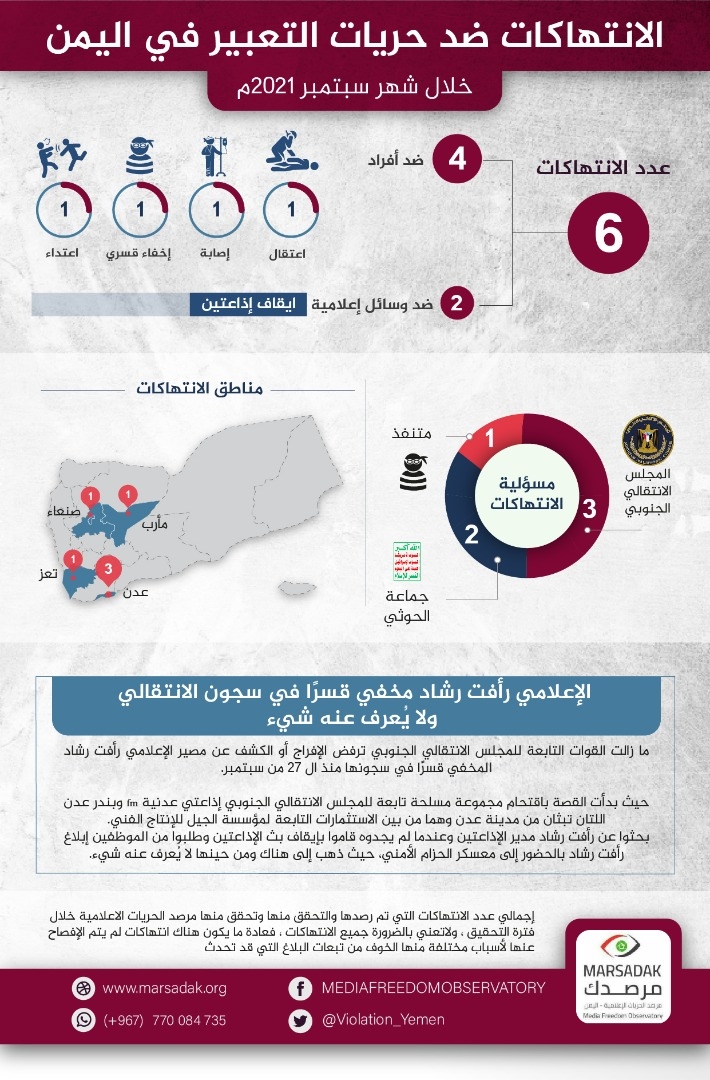 مرصد الحريات الإعلامية: 6 حالات انتهاك ضد الحريات الإعلامية خلال شهر سبتمبر 2021م