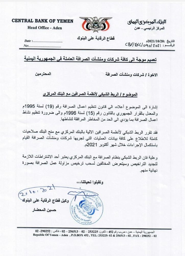 «المركزي اليمني» يمهل شركات الصرافة إلى نهاية أكتوبر لربطها بالبنك.. وثيقة