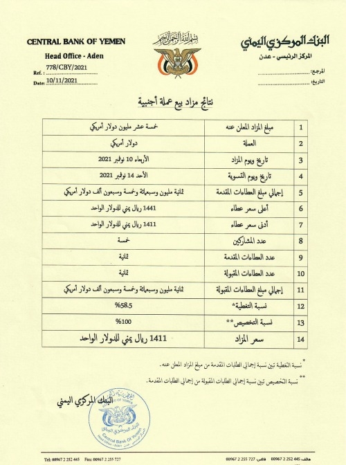 لافتاً في بلاغه بأن أعلى سعر عطاء بلغ 1441 ريال يمني للدولار وأدنى سعر 1411 ريال ، مؤكداً بأن مزادات بيع العملة الأجنبية ستكون مستمرة بشكل أسبوعي.