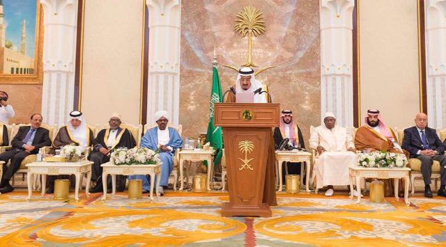 الحفل الذي دعا له الملك سلمان والقى فيه كلمه حضره ولي العهد محمد بن سلمان وضيوف بارزين بينهم الرئيس السوداني عمر البشير.