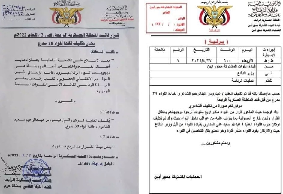 حيث كشفت وثيقة رسمية صادرة عن ما يسمى بـ "القوات المشتركة" في أبين لرفض قرار صادر من قائد المنطقة العسكرية الرابعة اللواء فضل حسن بتعيين قائد جديد للواء 39 مدرع.