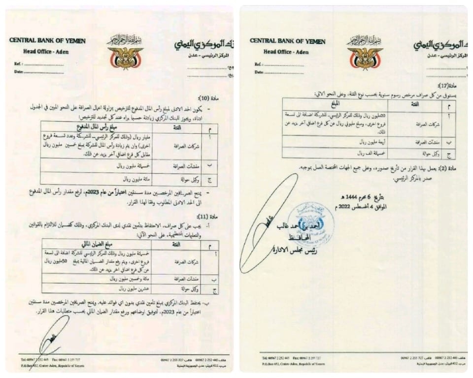 مركزي عدن يصدر قرارات جديدة لضبط وتنظيم سوق الصرافة - وثيقة