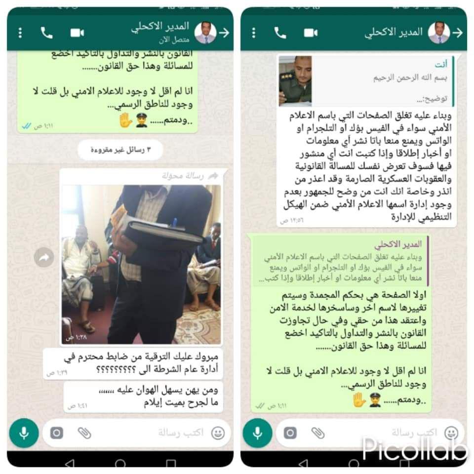 اتهم أحد ضباط الأمن في محافظ تعز مدير عام الأمن العميد منصور الاكحلي بالقيام بتهديده وشمته على خلفية توضيح نشره في صفحته الشخصية على الفيس بوك.