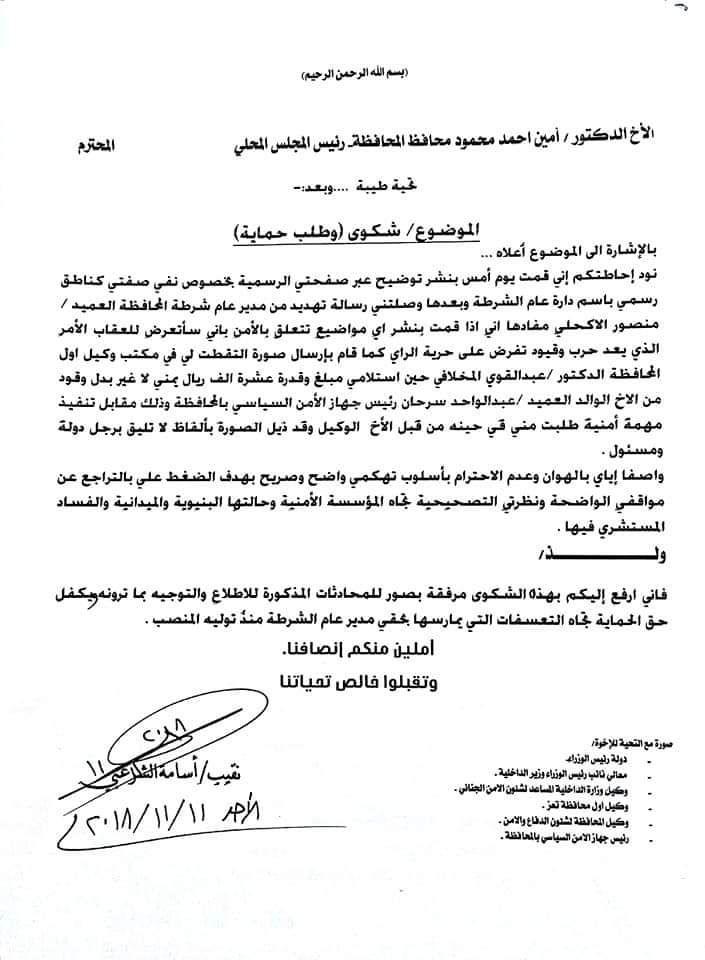 وقال النقيب اسامة الشرعبي في شكوى رسمية رفعها للمحافظ بأن رسائل تهديد ووعيد وصلته من قبل الاكحلي ،بالإضافة إلى الفاظ قدح مهينة وتعريض بالسب بصورة لا تليق ، حسب قوله.