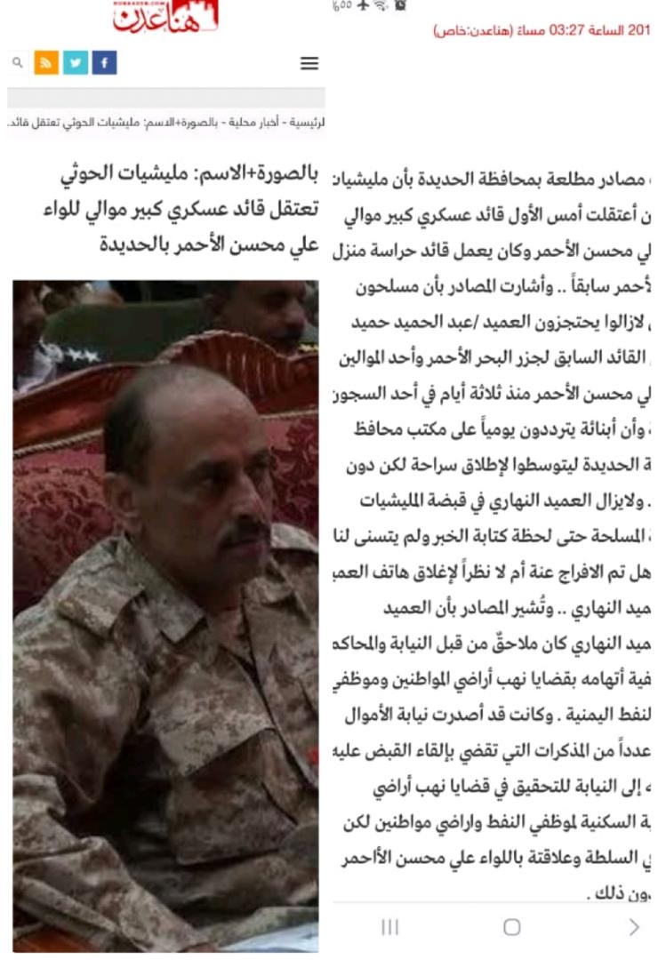 موقع "هنا عدن" الذي يديره الإخواني / أنيس منصور ، أكد حينها بان العميد النهاري الذي اختطفته مليشيات الحوثية في الحديدة ووصفته بانه "يعد قائداً عسكرياً كبيراً موالي للواء علي محسن الأحمر وكان يعمل قائد حراسة منزل اللواء الأحمر سابقاً".
