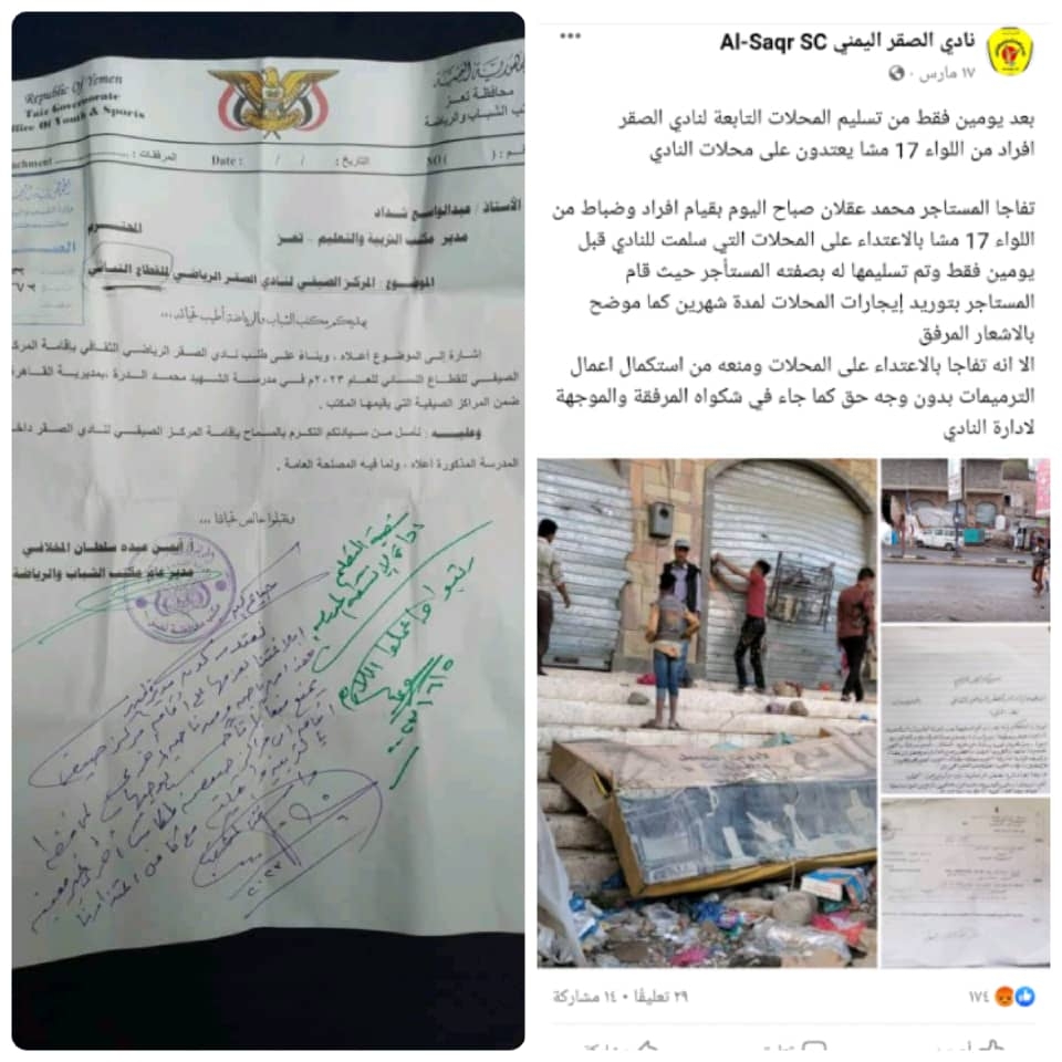 نادي الصقر بتعز يؤكد استمرار احتلال مقره من قبل قوات المحور - وثائق