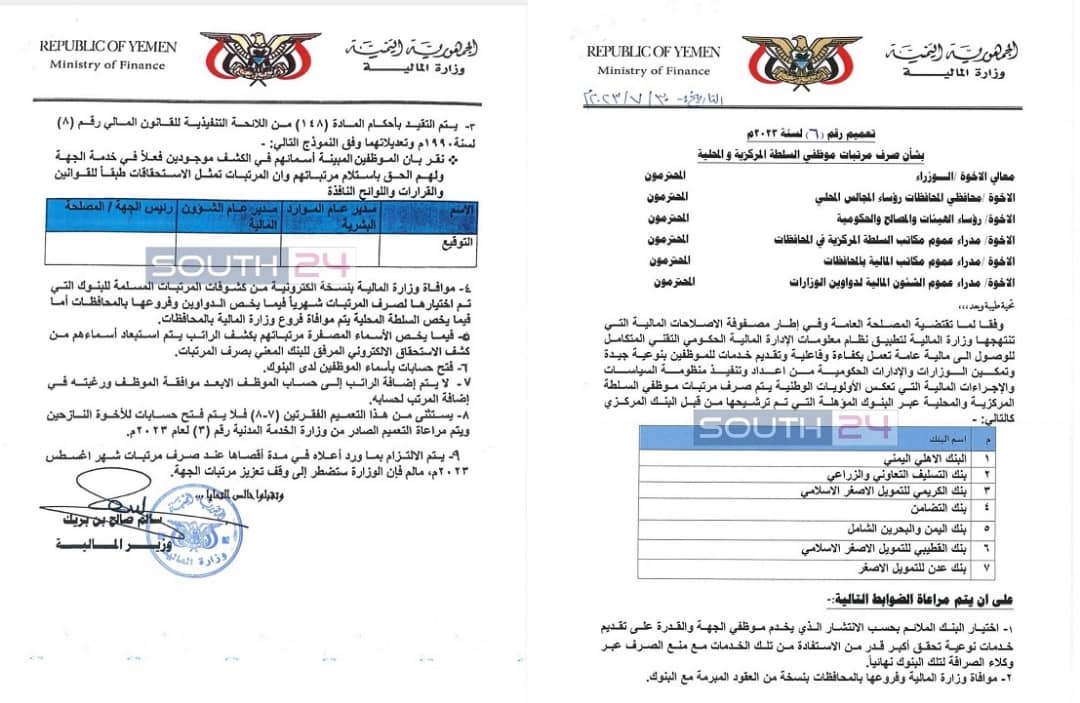 وقضى التعميم بصرف مرتبات موظفي السلطة المركزية والمحلية عبر 7 من البنوك "المؤهلة التي تم ترشيحها من قبل البنك المركزي" ، حسب قول الوزير.
