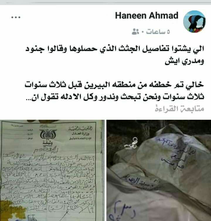 لتنشر الناشطة الشبابية حنان أحمد الحبشي وهي وكيل أول وزارة الصحة في حكومة الشباب على صفحتها بالفيس بوك ، بأن الاسم المذكور يعود لخالها الذي تم اختطافه من قبل عناصر الاصلاح قبل نحو 3 سنوات.