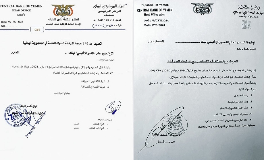 بالمقابل –وفق نصر– يقوم البنك المركزي في عدن بإلغاء التوجيه بعدم التعامل مع البنوك "بنك التضامن، بنك اليمن والكويت، بنك الأمل للتمويل الأصغر، مصرف اليمن والبحرين الشامل، بنك الكريمي للتمويل الأصغر الإسلامي"، وعدد من شركات الصرافة الأخرى.