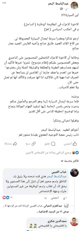 طالب ناطق محور تعز الخاضع لسيطرة جماعة الاخوان العقيد / عبدالباسط البحر من عضو مجلس القيادة الرئاسي وقائد المقاومة الوطنية العميد / طارق صالح بصرف سيارة خاصة له.
