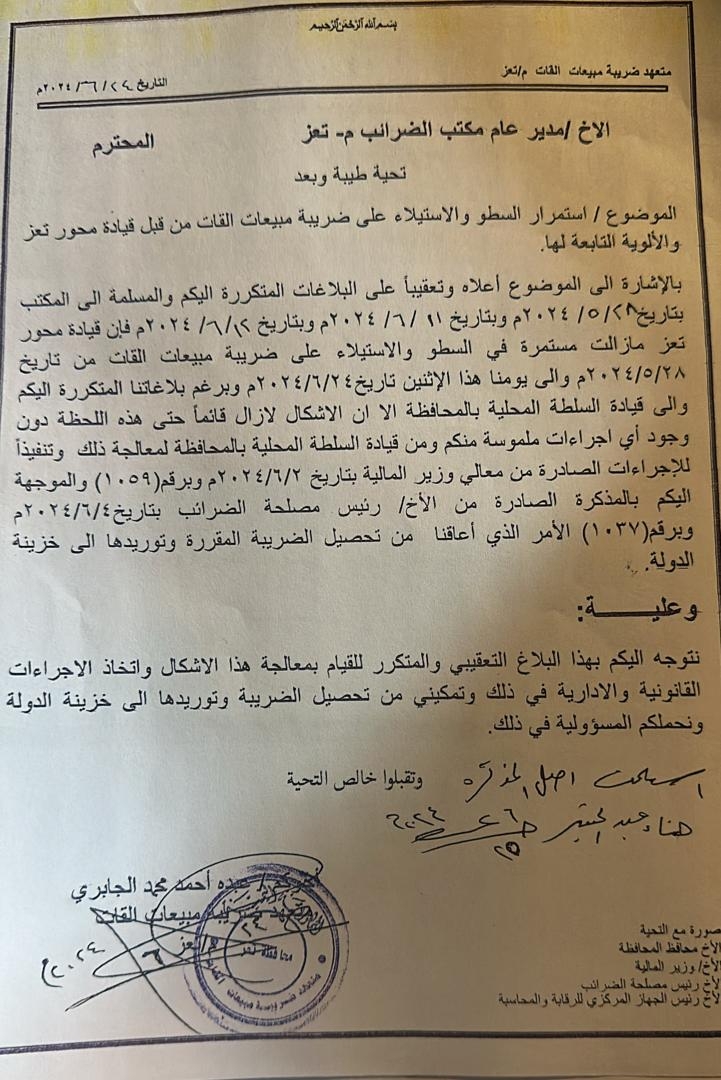 جاء ذلك في خطاب وجهه المتعهد الرسمي لتحصيل ضريبة القات في تعز الى مدير عام مكتب الضرائب بالمحافظة ، كشف فيه استمرار السطو والاستيلاء على ضريبة مبيعات القات من قبل قيادة محور تعز والألوية التابعة لها.