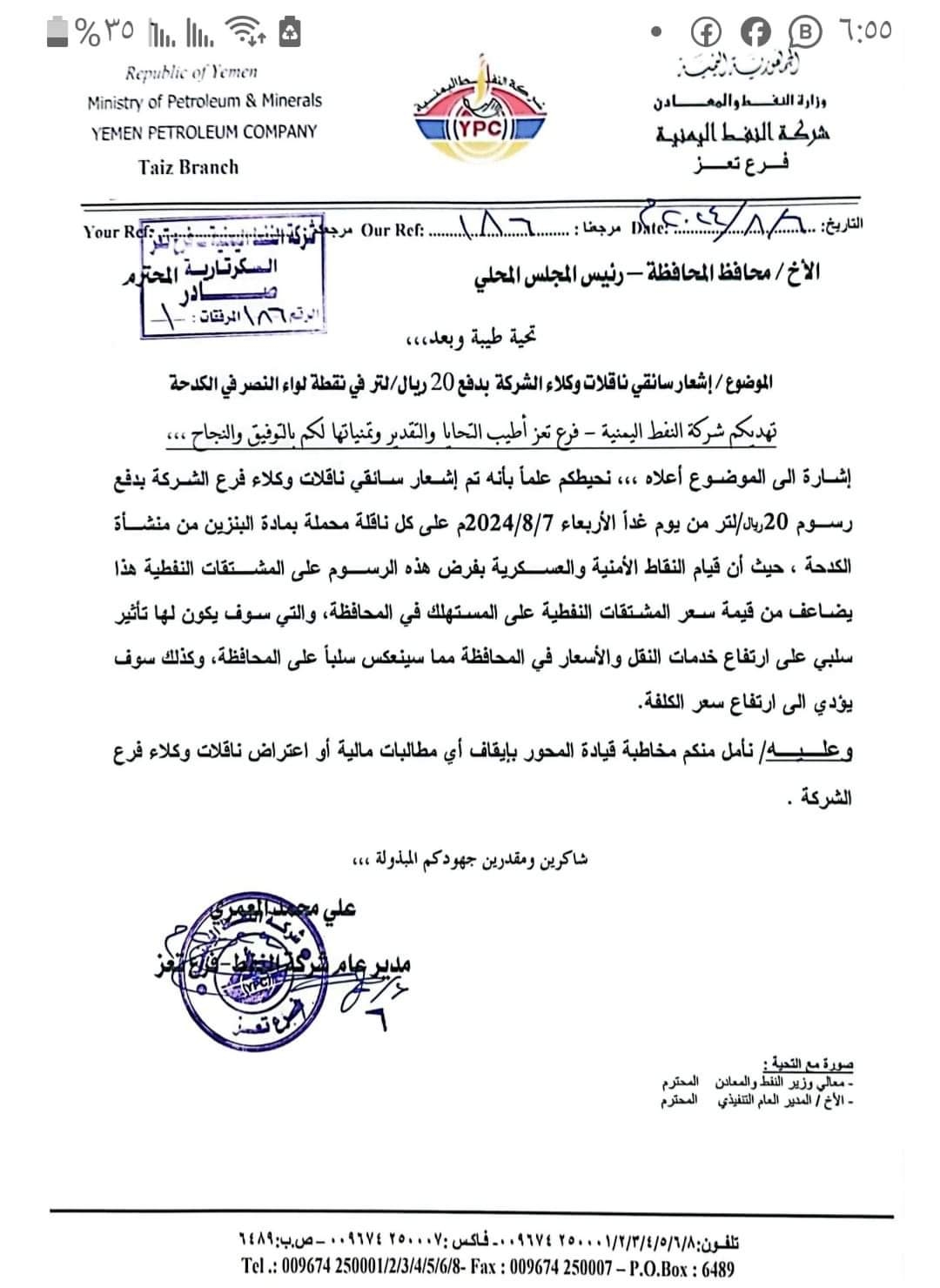 ووجه مدير عام شركة النفط اليمنية بتعز مذكرة رسمية الى المحافظ ، كشف فيها عن تلقي سائقي ناقلات وكلاء الشركة إشعارا بدفع 20 ريال / لتر في نقطة تابعة لما يسمى بـ "لواء النصر" في منطقة الكدحة غربي تعز.