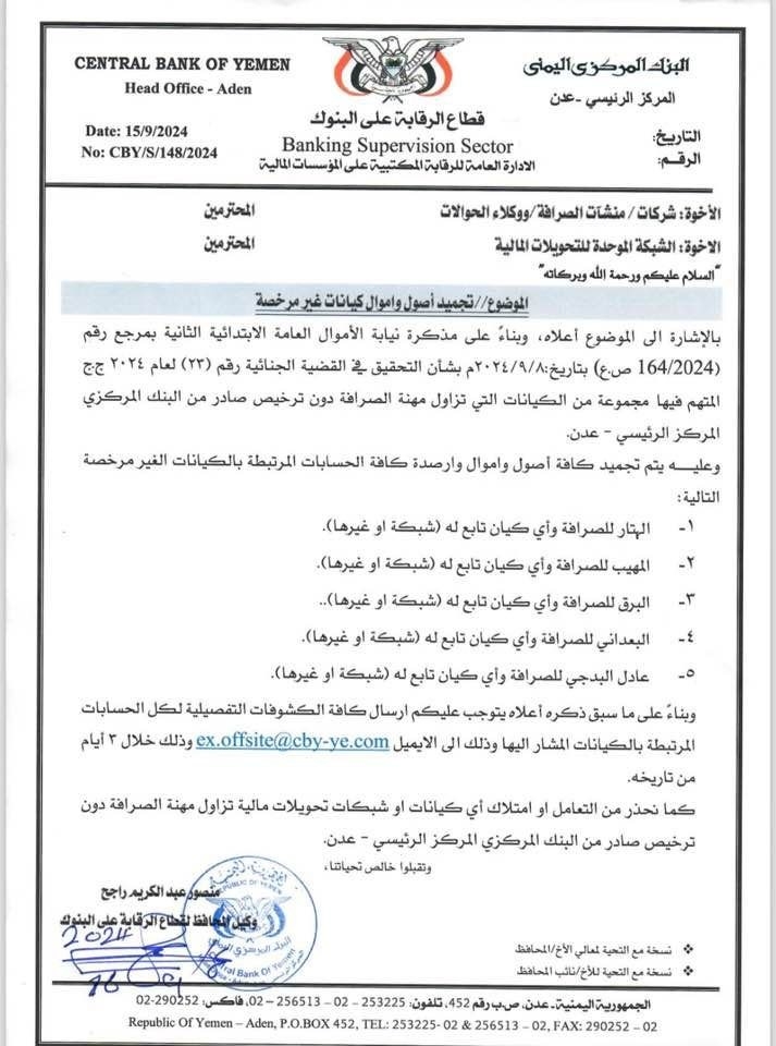 البنك المركزي اليمني بعدن يجمّد أصول خمس شركات صرافة غير مرخصة- وثيقة