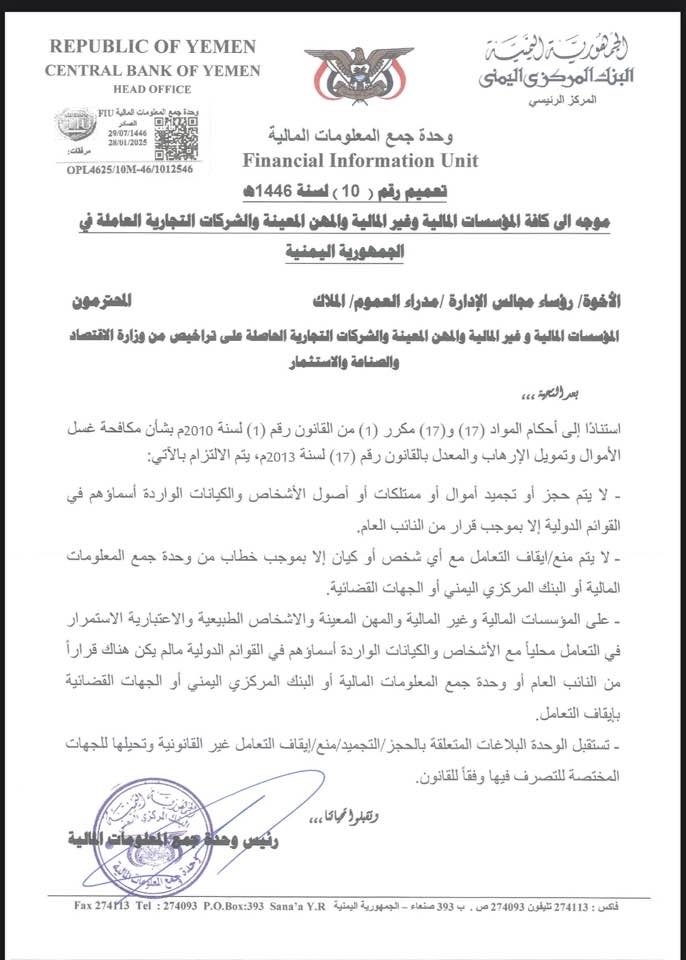 مشددا على أنه لا يمكن إيقاف التعامل مع أي شخص أو كيان إلا بعد الحصول على خطاب رسمي من وحدة جمع المعلومات المالية أو البنك المركزي اليمني أو الجهات القضائية المختصة.