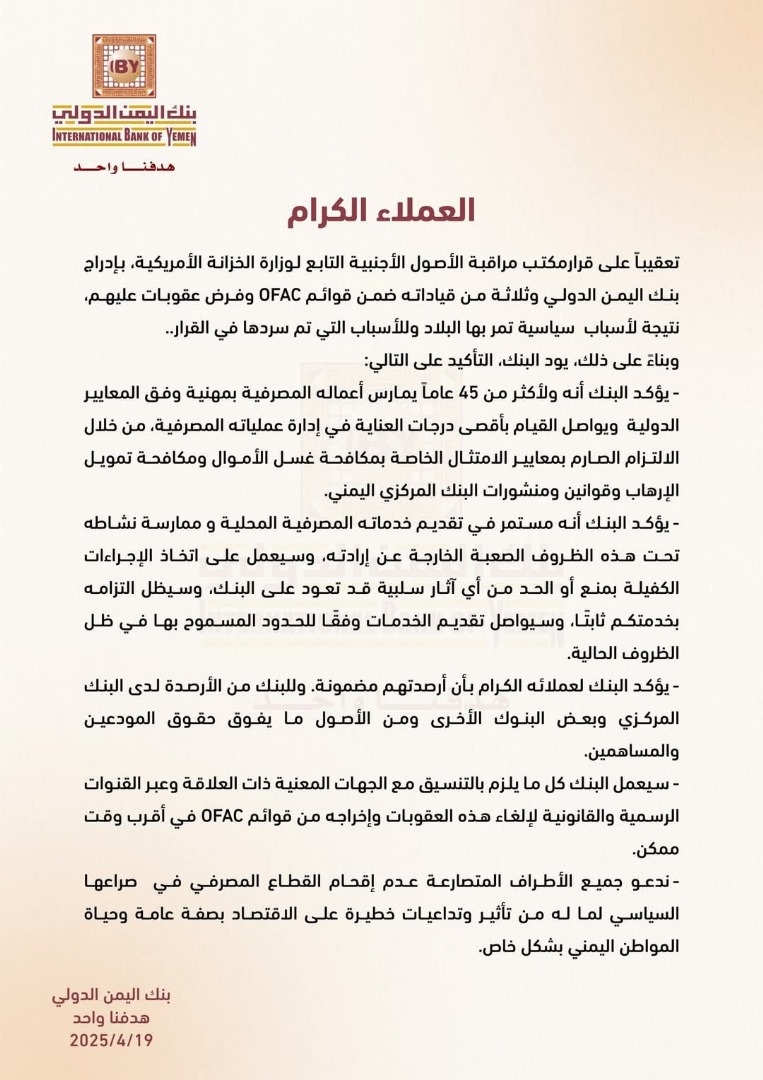 أصدر بنك اليمن الدولي، اليوم السبت، بيانًا رداً على العقوبات الأمريكية التي طالته بتهمة تقديم الدعم لمليشيا الحوثي المصنفة على قوائم الإرهاب في واشنطن.