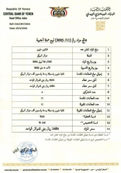 وبحسب البنك بلغت عطاءات المزاد 8 ملايين و996 ألف دولار، بنسبة تغطية 30% فقط ، وبسعر أدنى صرف في المزاد وهو 2484 ريالاً للدولار.