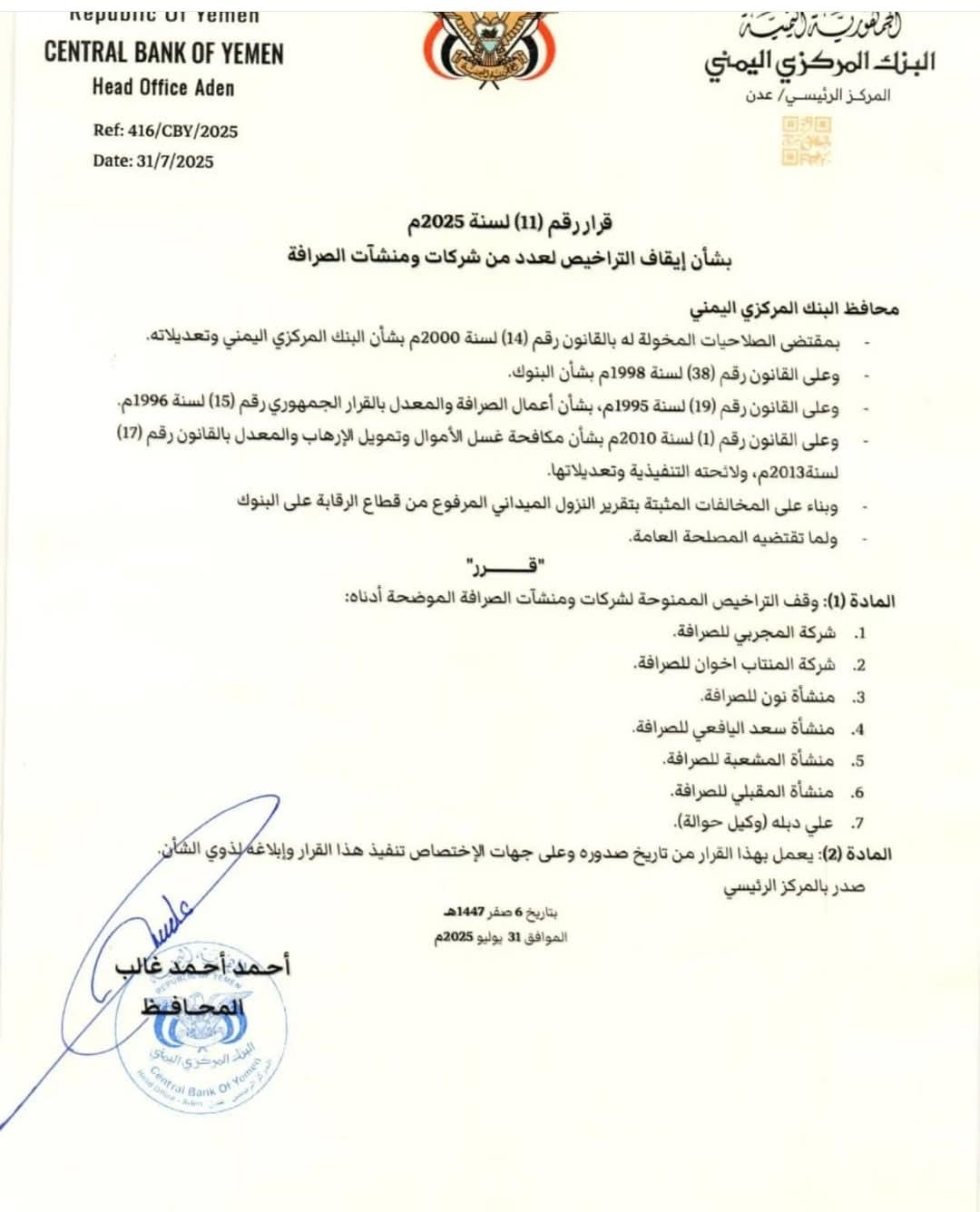 واصدر المحافظ اليوم الخميس قراراً بوقف 7 من شركات ومنشآت الصرافة بسبب المخالفة المثبتة وفق تقارير النزول الميداني المرفوع من قطاع الرقابة على البنوك.