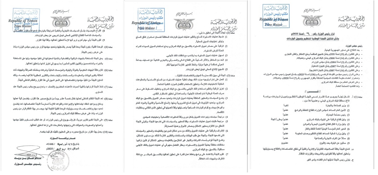 كشف وثيقة لنص قرار رئيس الوزراء سالم بن بريك بتشكيل اللجنة الوطنية لتنظيم وتمويل الواردات ، عن هيكل اللجنة ومهام وصلاحيات واسعة لها.