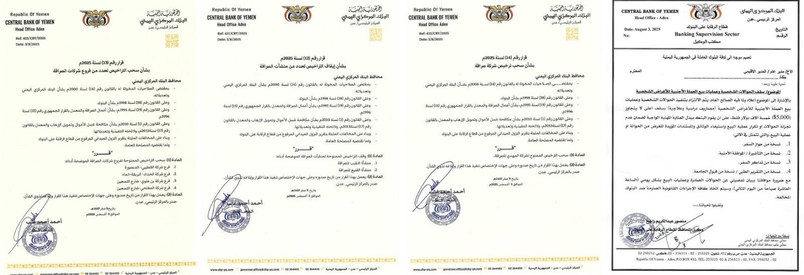 في حين نص القرار الثالث على سحب التراخيص الممنوحة لفروع شركات ومنشآت الصرافة التالية، بتهمة مخالفة أنظمة وتوجيهات البنك ، وهي فرع شركة القطيبي – المنصورة، فرع شركة الحديد - البريقة – إنماء ، فرع شركة بن علوي - شارع التسعين ، فرع شركة المفلحي - شارع التسعين.