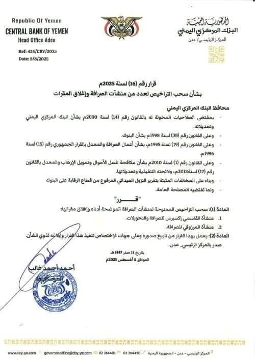 واصدر المعبقي اليوم الثلاثاء القرار رقم 16 بسحب تراخيص واغلاق مقرات كل من :