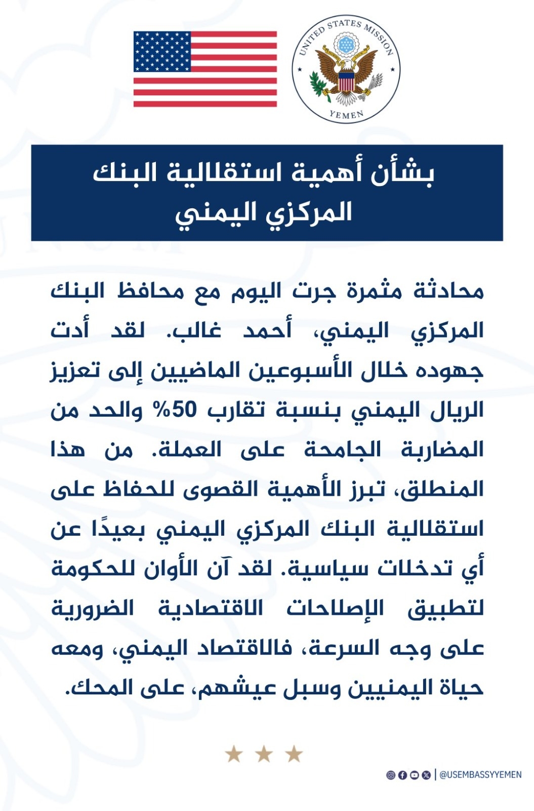 أشادت السفارة الامريكية لدى اليمن بالجهود والخطوات التي قام بها البنك المركزي اليمني في عدن مؤخراً ، وأدت الى تحسن في قيمة العملة المحلية.