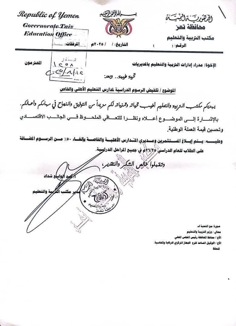 واصدر مدير مكتب التربية بتعز عبدالواسع شداد تعميماً الى مدراء إدارات التربية والتعليم بالمديريات تخفيض الرسوم الدراسية لمدارس التعليم الأهلي والخاص، بعد التعافي الملحوظ في قيمة العملة الوطنية.