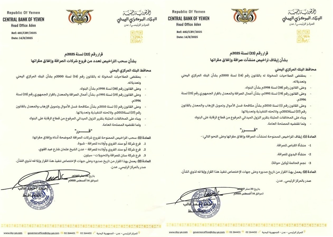 وبموجب القرار الأول، تم إيقاف الترخيص الممنوح لمنشأة ريدان للصرافة وإغلاق مقرها الرئيسي، ونص القرار الثاني، على إغلاق فرع شركة الأحقاف للصرافة في مدينة عتق بمحافظة شبوة.