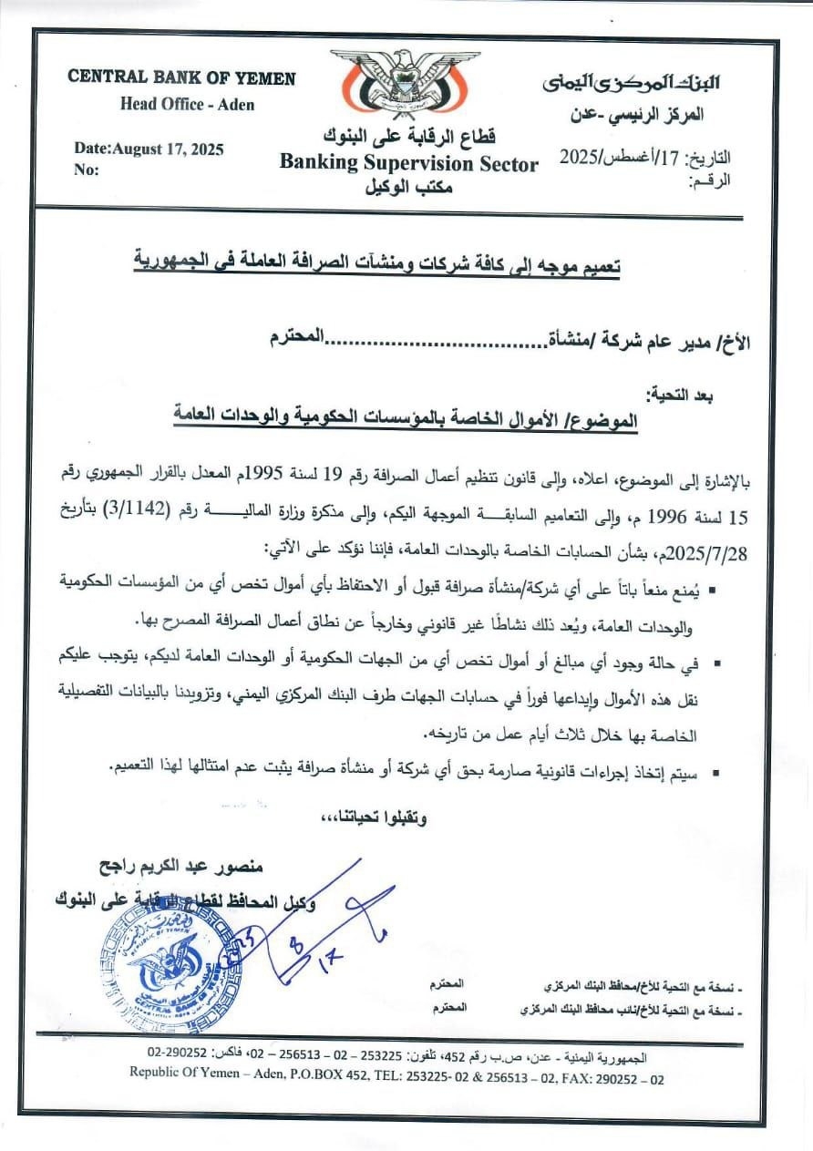 وجه البنك المركزي اليمني بالعاصمة عدن كافة شركات ومنشآت الصرافة العاملة في الجمهورية بعدم الاحتفاظ بأي حسابات او أموال تابعة لجهات حكومية.