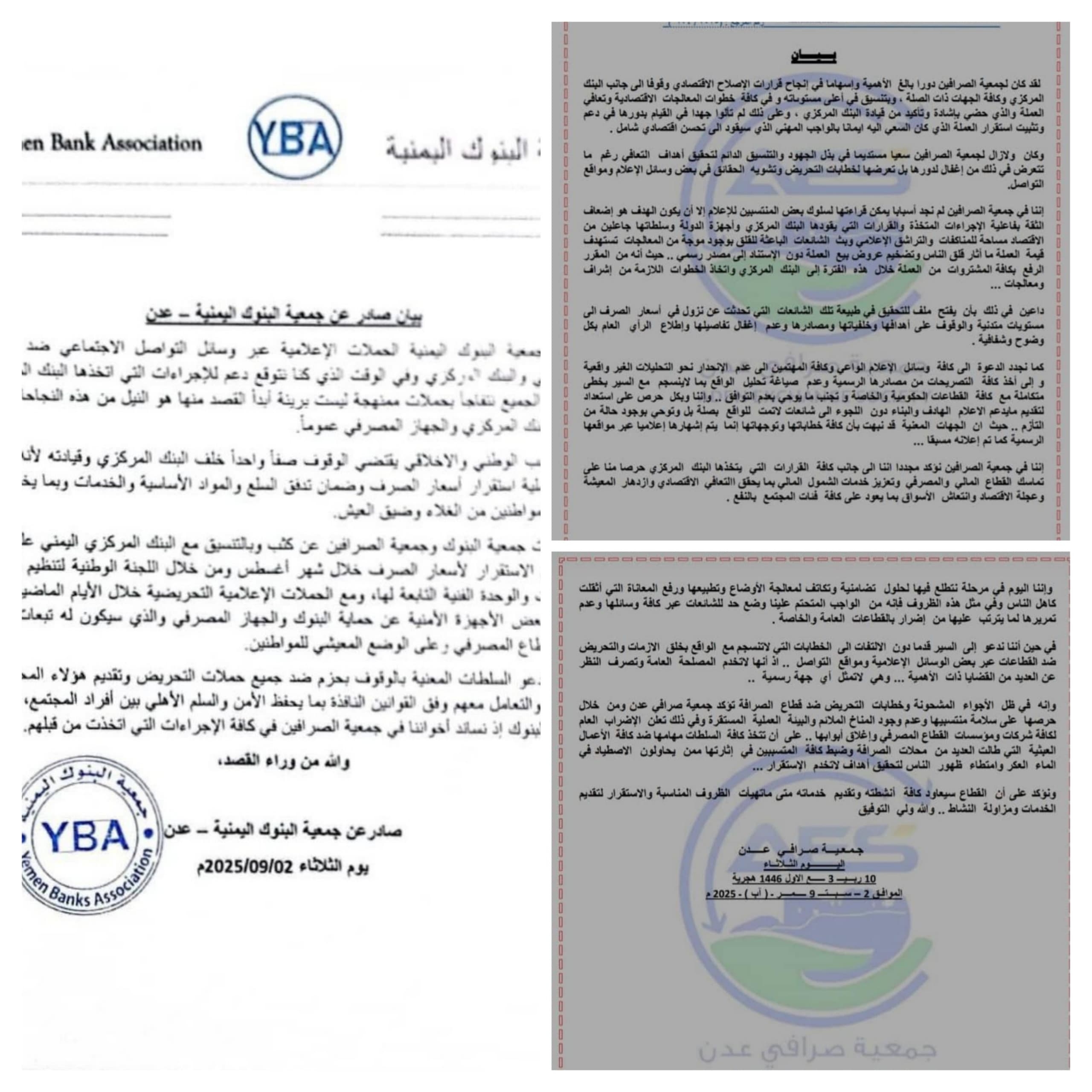 من جانبها أصدرت جمعية البنوك اليمنية، بياناً اشارت فيه الى تفاجأها مما اسمتها بحملات ممنهجة تستهدف النيل من النجاحات التي حققها البنك المركزي والجهاز المصرفي عموماً ، خلال الفترة الأخيرة.