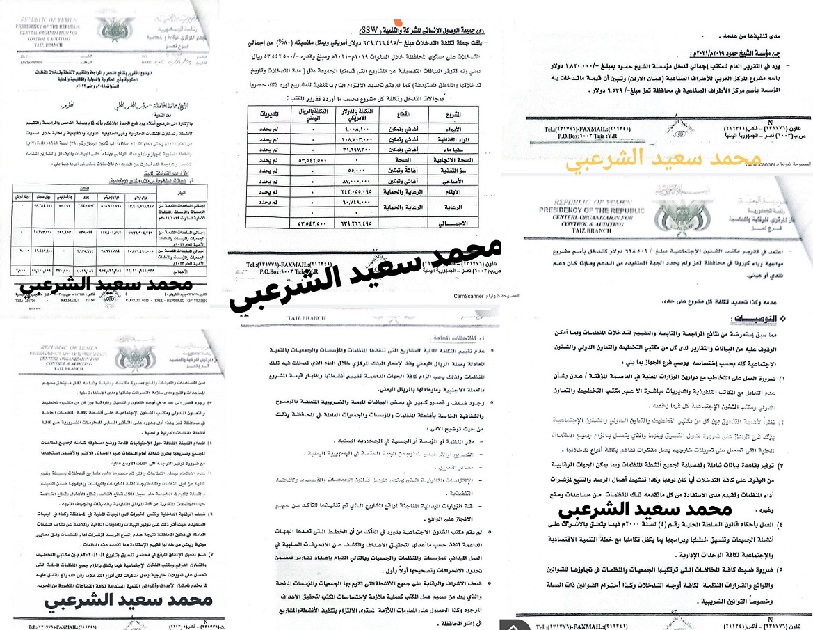 الا ان تقرير الجهاز يكشف بانه تبين أن قيمة ما تدخلت به المؤسسة باسم مركز الأطراف الصناعية في محافظة تعز مبلغ ٦٥٣٩ دولار فقط ، مشيراً أيضاً الى ان تقرير مكتب الشئون الاجتماعية اعتمد مبلغ 628 ألف دولار أمريكي كتدخل للمؤسسة المخلافي باسم مشروع مواجهة وباء كورونا في محافظة تعز ، ويعلق التقرير قائلاً : لم يحدد الجهة المستفيدة من الدعم وما إذا كان دعم نقدي أو عيني.