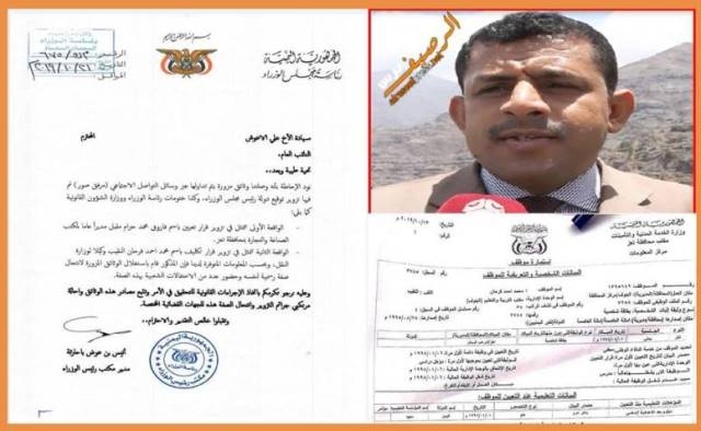 حيث وجه مكتب رئيس الوزراء النائب العام لاتخاذ الاجراءات القانونية والتحقيق في حادثتي تزوير لقرارات رسمية ، الأولى تتمثل في تزوير قرار تعيين باسم ”فاروق محمد حزام مقبل” مديرا عاما لمكتب الصناعة والتجارة بمحافظة تعز.
