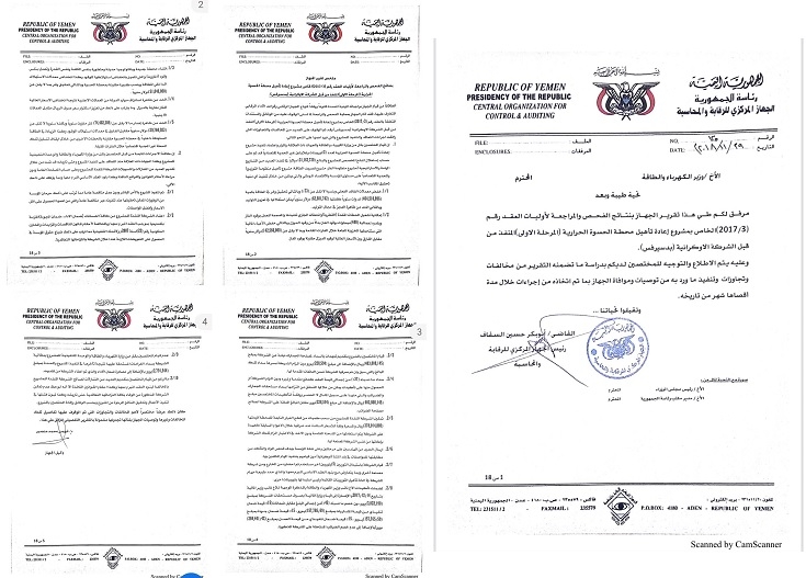 الوثائق تعود الى تقرير صادر عن الجهاز المركزي للرقابة والمحاسبة حول مراجعة مشروع إعادة تأهيل محطة الحسوة الحرارية في عدن، والذي جرى في فترة رئيس الوزراء السابق احمد عبيد بن دغر ووزير الكهرباء السابق عبد الله محسن الأكوع أحد قيادات جماعة الاخوان.
