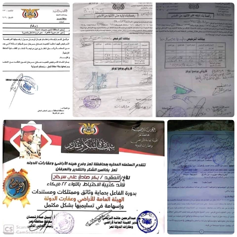 حيث لفتت المصادر الى ان سلطة الإخوان بتعز كانت قد منحت بكر سرحان شهادة تقدير أواخر عام 2019م بسبب " دوره الفاعل في حماية وثائق وممتلكات الهيئة العامة للأراضي وعقارات الدولة".