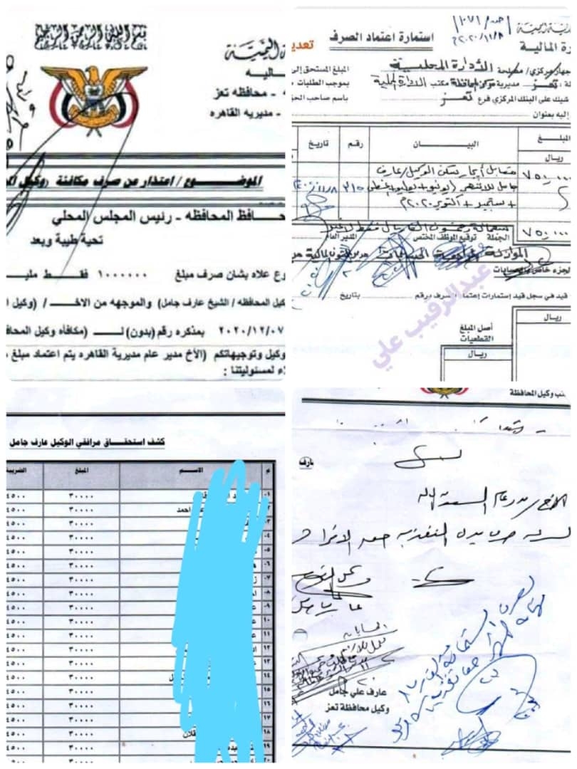 مشيرة الى ان جامل يتسلم شهرياً اكثر من مليون ريال تحت مسمى "الأشراف"على مديرية من إيرادات مديرية واحدة فقط في المدينة، وهي القاهرة وفقاً للوثائق التي تم تسريبها مؤخراً.