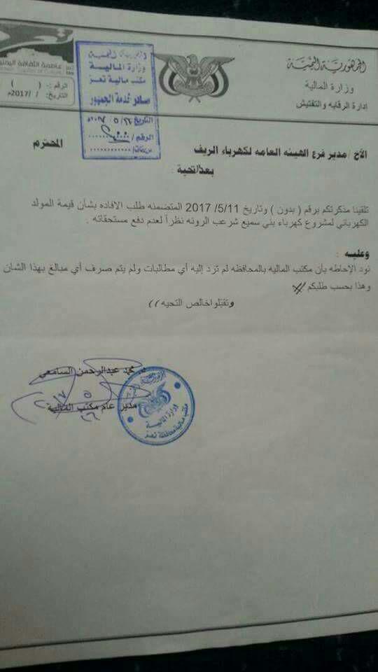 وهو يتناقض مع حديث مدير كهرباء الريف بان التاجر لم يتسلم قيمته وظل يطالب بقيمته في حين ان مكتب مالية تعز ينفي وجود اي مطالبة بهذا الخصوص.