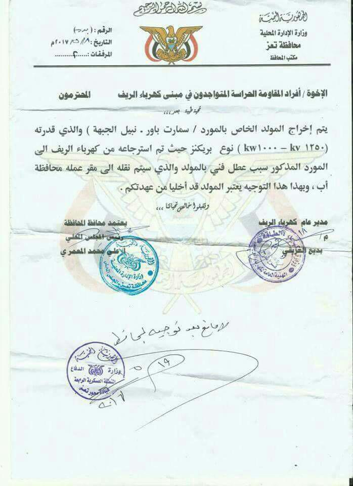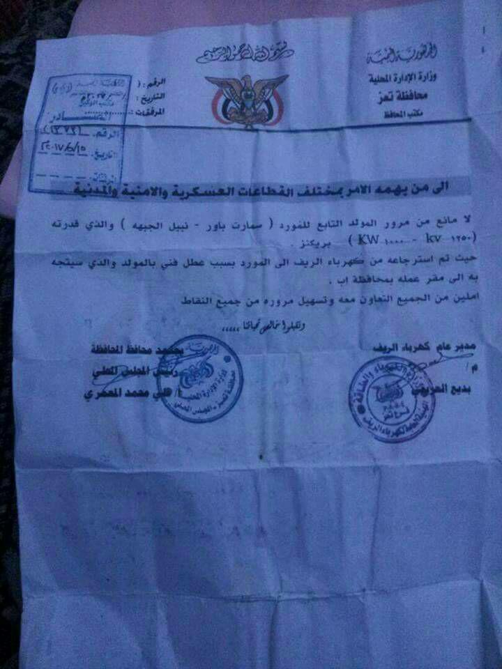 وهو ما تأكده ايضا وثيقة ثالثة موقعة من المحافظ ومدير كهرباء الريف للنقاط الأمنية بالسماح للمولد بالمرور الى خارج تعز بسبب عطل فني.
