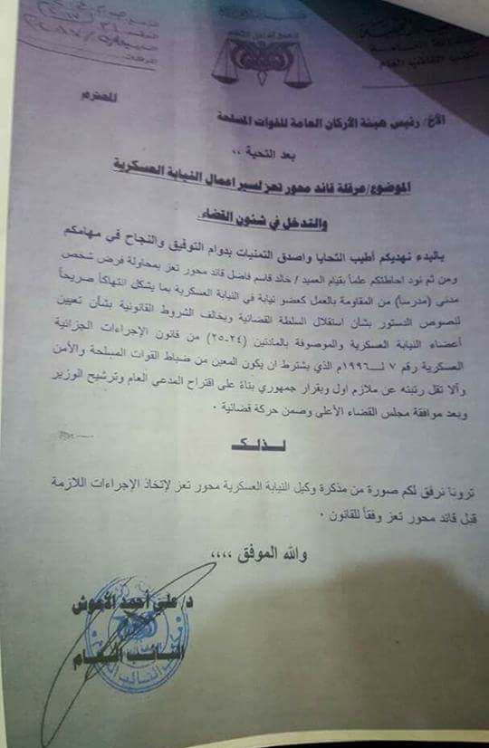 وكان النائب العام الدكتور علي أحمد الأعوش قد وجه مذكرة لرئيس هيئة الأركان وطلب منه اتخاذ اجراءات القانونية ضد قائد محور تعز، وأرفق النائب العام لرئيس هيئة الأركان مذكرة تقدم بها وكيل النيابة العسكرية العقيد القاضي عبدالعزيز العباسي.