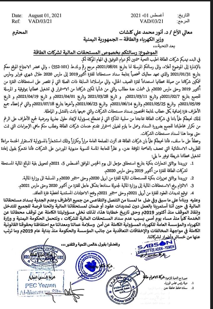 الشركات وفي رسالة جماعية أرسلتها يوم امس الى وزير الكهرباء أنور كلشات ، طالب بدفع مستحقاتها المالية المتأخرة من شهر أكتوبر 2019م الى غاية مارس 2021م ، مع تمديد العقود معها من فترة ابريل 2021 الى سبتمبر 2021 وفتح الاعتمادات المستندية لذلك.