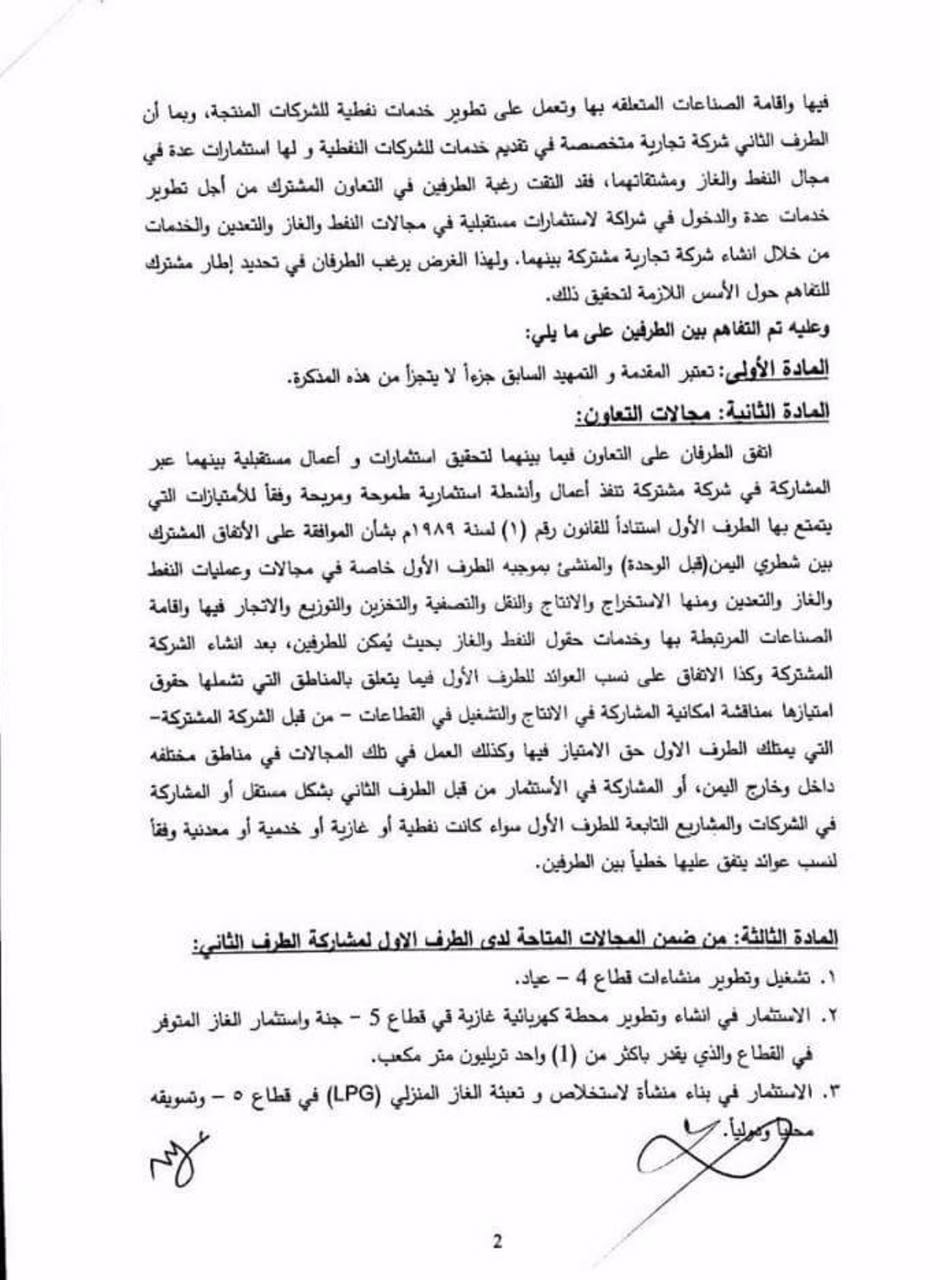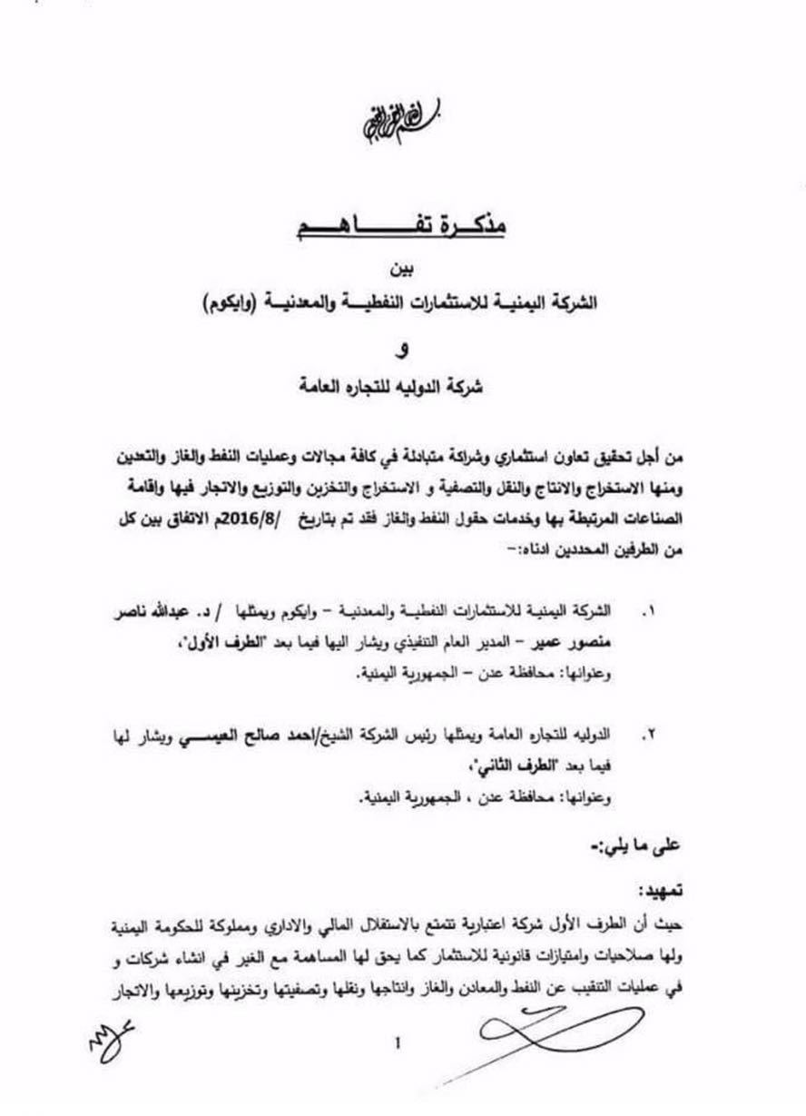 الاتفاقية التي وقعت في اغسطس من العام الماضي عقب تحرير محافظة شبوة من مليشيات الحوثي وصالح بين الشركة اليمنية للاستثمارات النفطية والمعدنية ويمثلها مديرها العام عبدالله عمير وبين شركة يملكها رجل الأعمال أحمد العيسي.