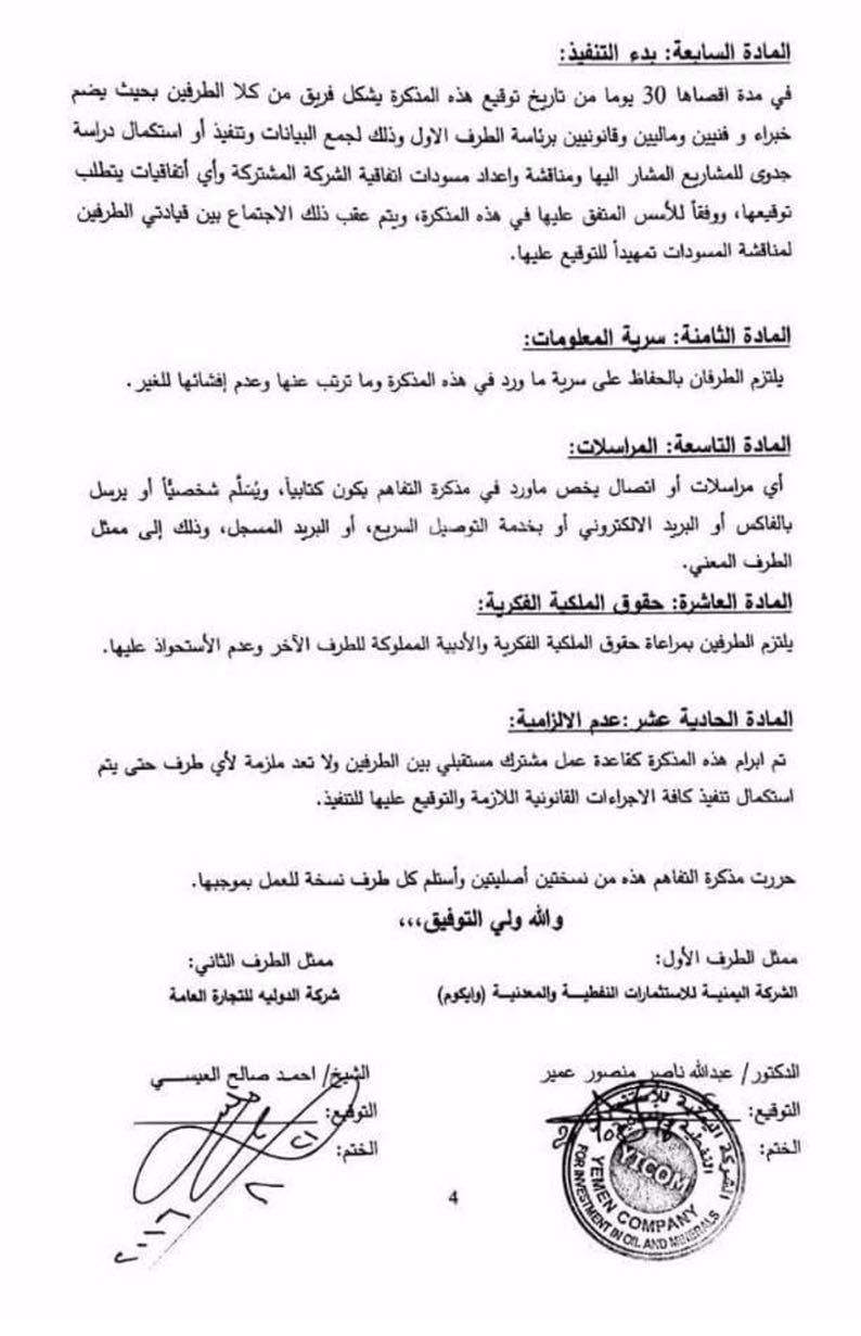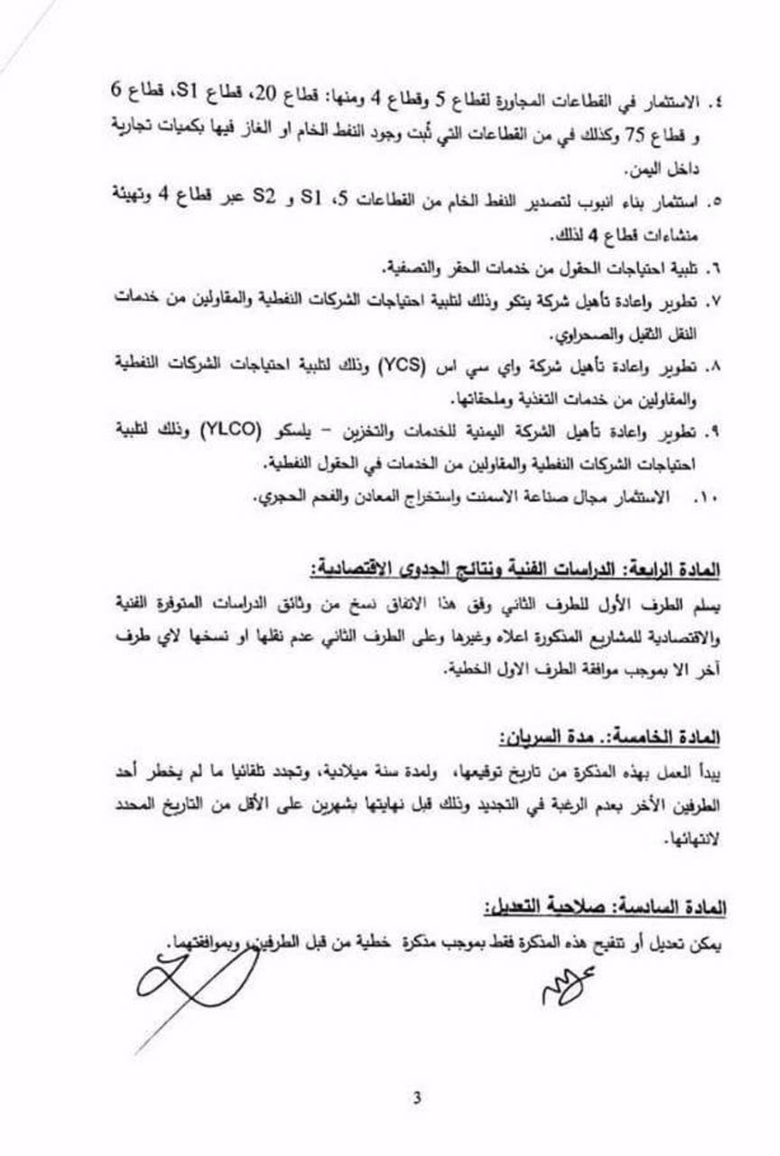 كما تمنح الاتفاقية شركة العيسي نسخ كافة الدراسات الفنية والوثائق عن حقول النفط والغاز من الشركة اليمنية .