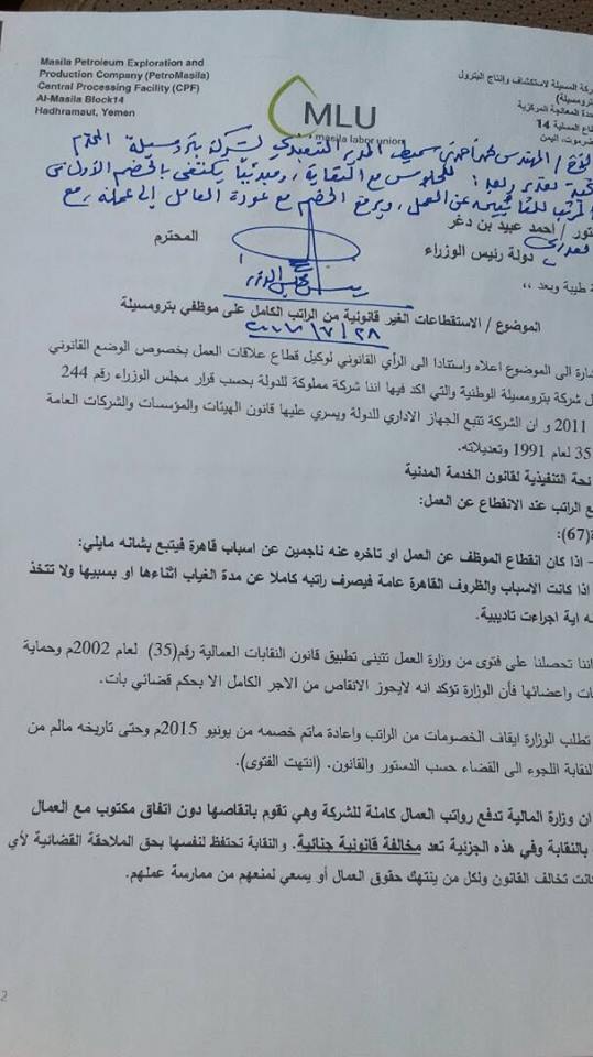 رفعت نقابة عمال بترومسيلة مذكرة لرئيس الوزراء في الحكومة الشرعية احمد عبيد بن دغر أطلعته فيها على الوضع في الشركة وما يمارس من مخالفات وانتهاكات ضد عدد كبير من الموظفين من قبل الإدارة، والتي وصلت حد خصم نسبة كبيرة من مرتباتهم بالمخالفة للقانون، حيث وجه رئيس الوزراء الى المدير التنفيذي لشركة بترومسيلة "للجلوس مع النقابة والاكتفاء بالخصم الأول الذي بلغ 25% من الراتب للغائبين عن العمل ورفع الخصم مع عودة العامل الى عمله".