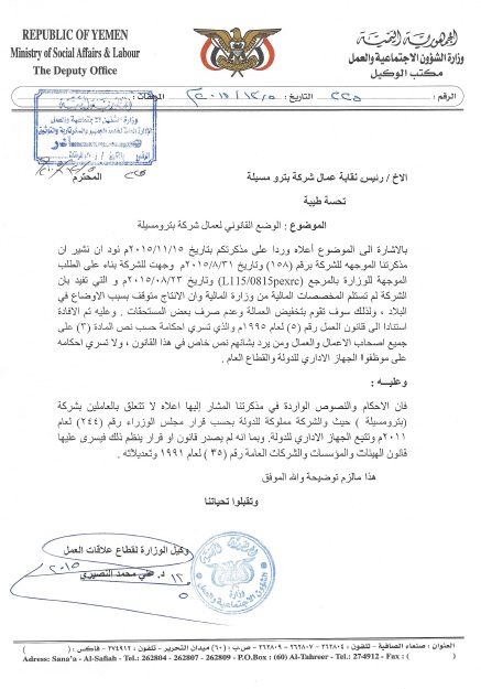 وحصل " الرصيف برس " أيضا على مذكرة مرسلة من وكيل قطاع علاقات العمل في وزارة الشئون الاجتماعية والعمل موجهة الى مدير شركة بترومسيلة يحيطه بان الوزارة تلقت شكوى من نقابة العمال تشير فيها الى ان الشركة أقدمت على رفع نسبة الاستقطاع الى 50 من الراتب الأساسي، مشيراً الى انه "وبما ان الوزارة تتبنى تطبيق قانون النقابات العمالية وحماية النقابات واعضائها فان الوزارة تؤكد على انه لا يجوز الإنقاص من الاجر الكامل الا بحكم قضائي بات".
