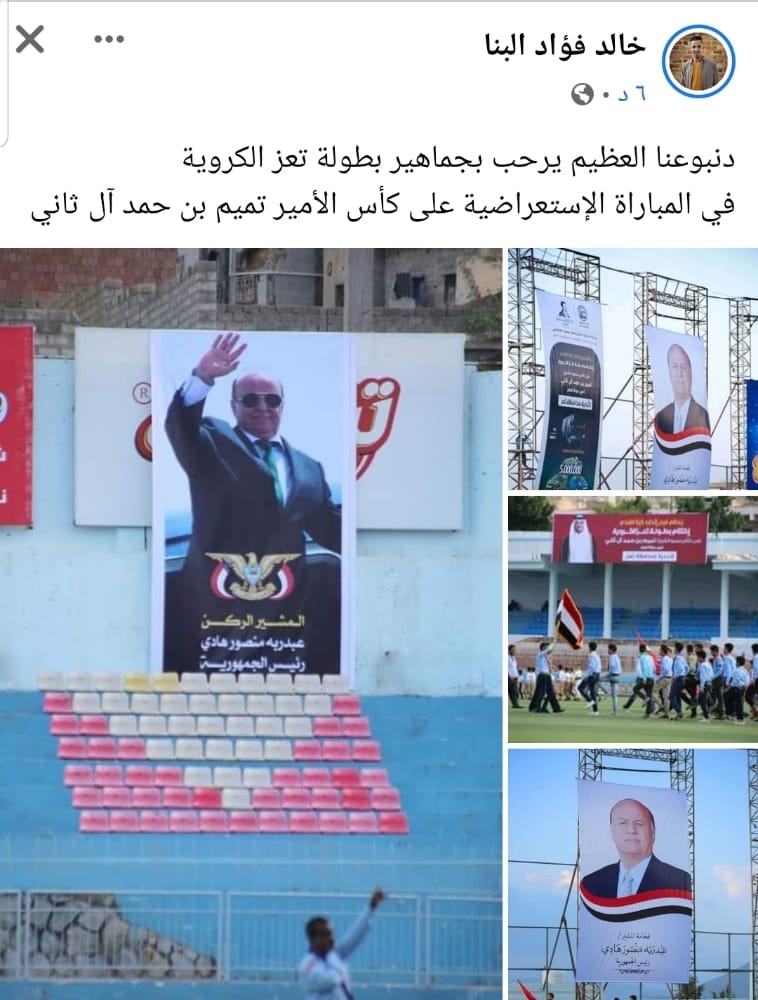 بلافتة تتوسط منصة ملعب الشهداء بتعز ، يظهر أمير قطر مبتسماً برعايته لبطولة كروية على كأس اطلق عليه إسمه من قبل جماعة الإخوان.