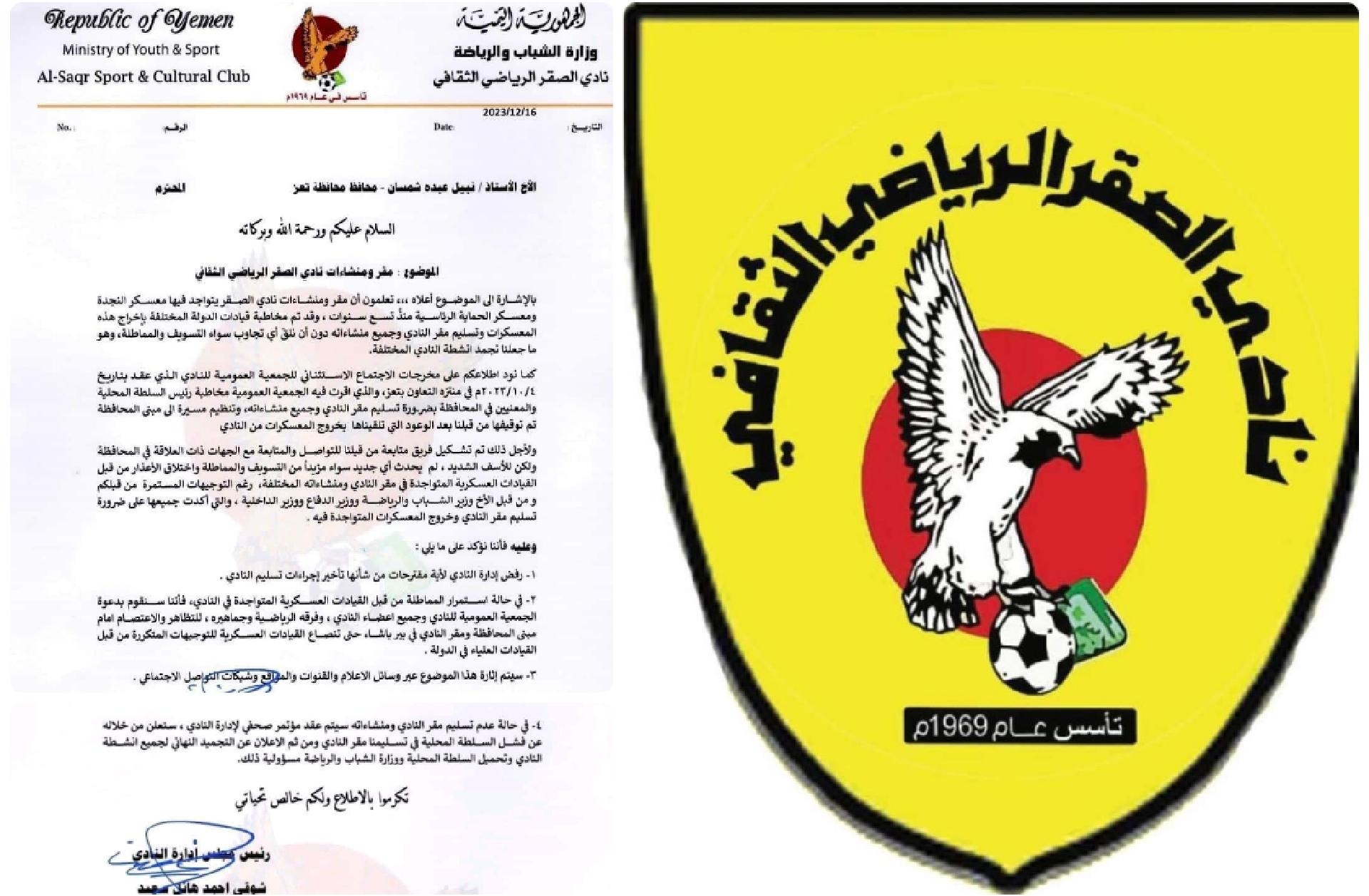جددت ادارة نادي الصقر الرياضي الثقافي اليوم السبت مطالبتها السلطة المحلية بمحافظ تعز باخلاء مقر وم ...