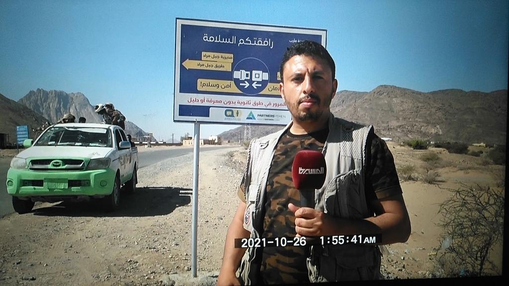 بإبتسامة خفيفة تعكس روح التشفي وقف مراسل قناة "المسيرة" التابعة لجماعة الحوثي متوس ...