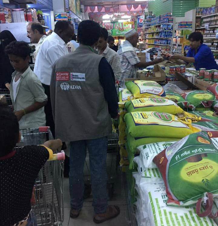 توزيع الأغذية الجافة على النازحين من مناطق الاشتباكات في تعز إلى عدن