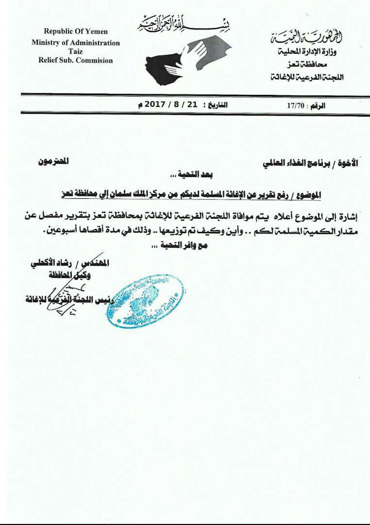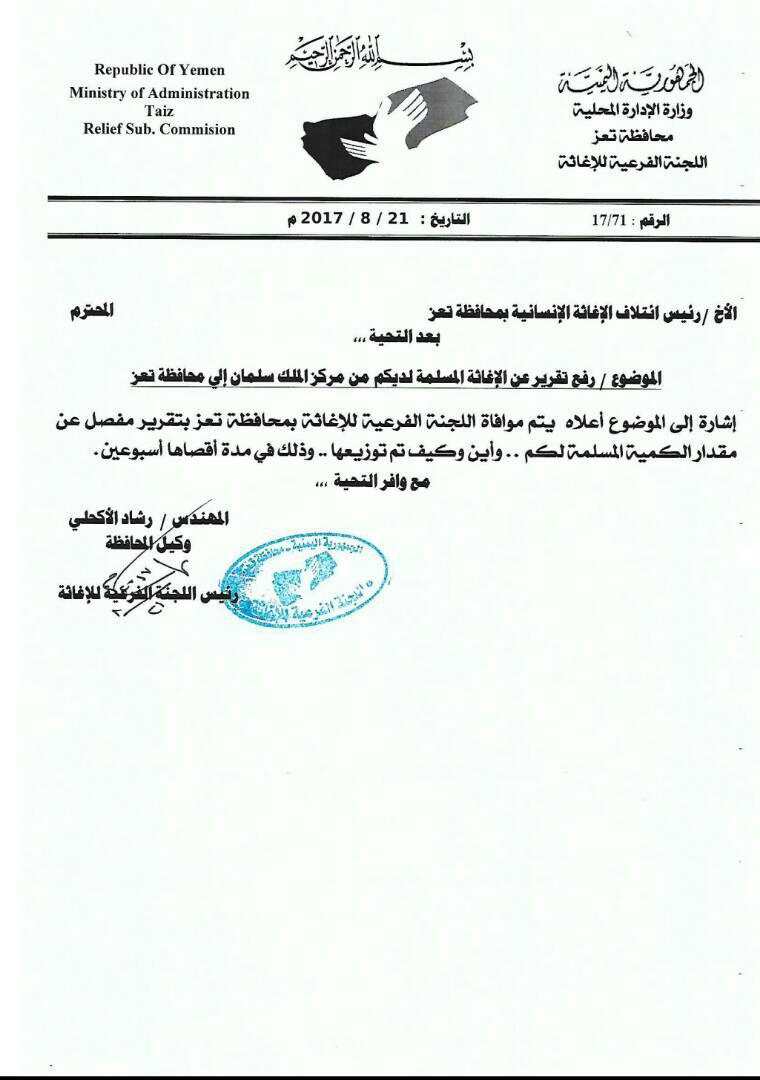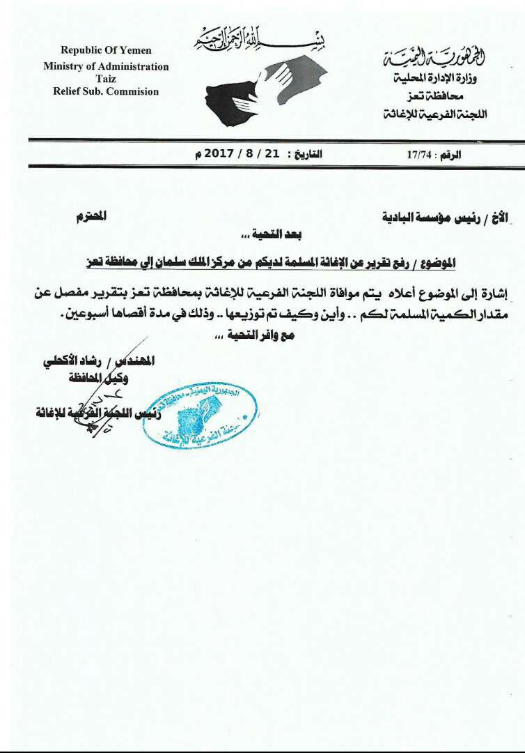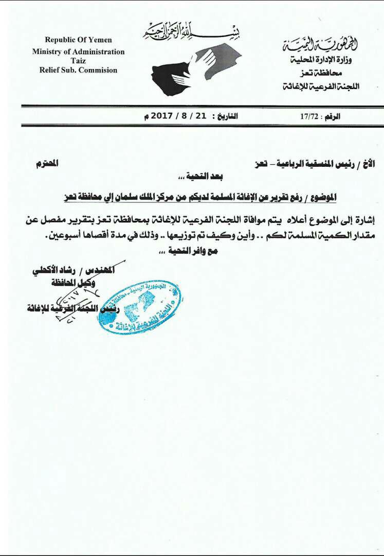 وكان رئيس اللجنة الفرعية للإغاثة بمحافظة تعز المهندس رشاد الأكحلي، قد بعث بوقت سابق بمذكرة إلى مركز الملك سلمان للإغاثة والأعمال الإنسانية للتكرم بموافاة اللجنة بأسماء الشركاء المحليين الذين تم تسليمهم السلل الغذائية التي أعلن المركز أنه قدمها لتعز والمقدرة بــ 871.023 سلة غذائية.