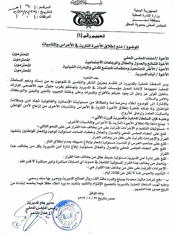 مديرية المعافر بتعز تمنع إطلاق الأعيرة النارية في الأعراس - وثيقة