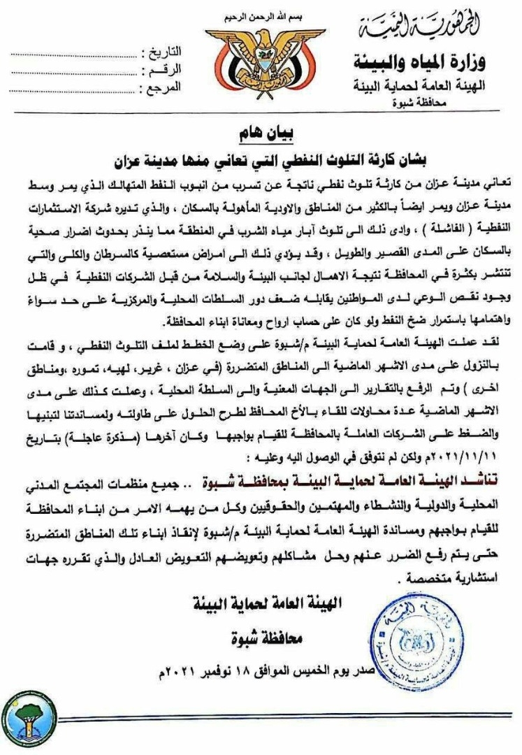 واشارت الهيئة العامة لحماية البيئة بمحافظة شبوة في بيان رسمي لها أصدرته أمس الخميس الى ما تعانيه مدينة عزان بمحافظة شبوة من كارثة تلوث نفطي ناتجة عن تسرب من أنبوب النفط المتهالك الذي يمر وسط المدينة عزان والكثير من المناطق المأهولة بالسكان.