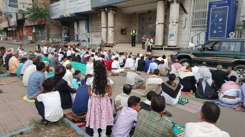 وصباحا أدى العشرات من موظفي تعز صلاة عيد الأضحى في شارع جمال عبدالناصر وسط المدينة احتجاجا على عدم وفاء حكومة بن دغر بوعودها وصرف رواتبهم .